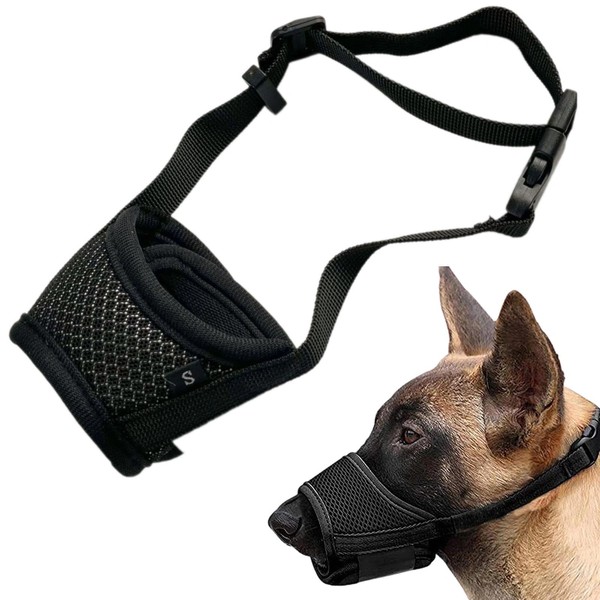 Dog Muzzle Breathable Mesh and Durable Nylon with Adjustable Loop and Soft Pad Dog Training Prevent for Barking Biting and Chewing (Black, S)