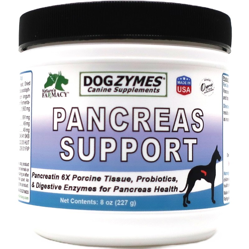 - Dogzymes Pancreas Support contains the same porcine sourced pancreatic enzymes sold by vets and other companies but delivers much better support.