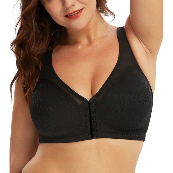 DotVol Front Closure Posture Bra Back Support Full Coverage Wirefree Jacquard Adjustable Strap(Black,46C)