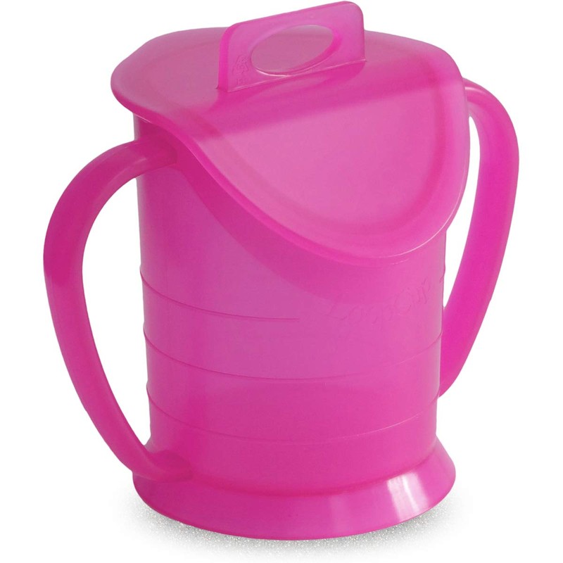 - Ergonomic design – no slipping off the mouth. No swallowing: prevents the tongue from pushing under the rim of the cup. Secure hold thanks to two large handle handles. Fill level always clearly visible. No spillage thanks to tilt-proof base and form-fitting locking lid. 150 ml capacity.