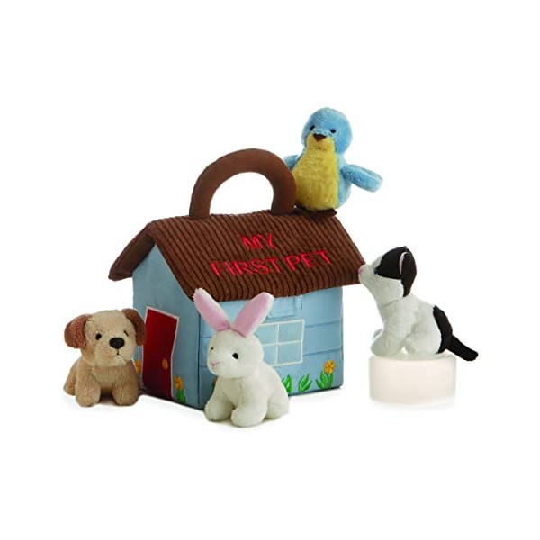 Aurora's award winning Baby Talk play sets encourage speech and learning through shape, sound and alphabet letter association. My First Pet features a house shaped carrier with "My First Pet" embroidered on it and contains soft toys that include a Bunny rattle, Bird with squeaker, Dog with barking sound, and Cat with meow sound. For ages 9 - 18 months. Aurora World is an industry leader with over 30 years of experience designing and manufacturing innovative, high quality plush products.