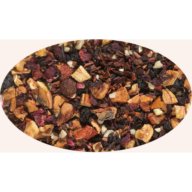 - Apple pieces, cinnamon pieces, hibiscus flowers, almond pieces, rose hip peels, lilac berries, corinths, blackcurrants, aroma.