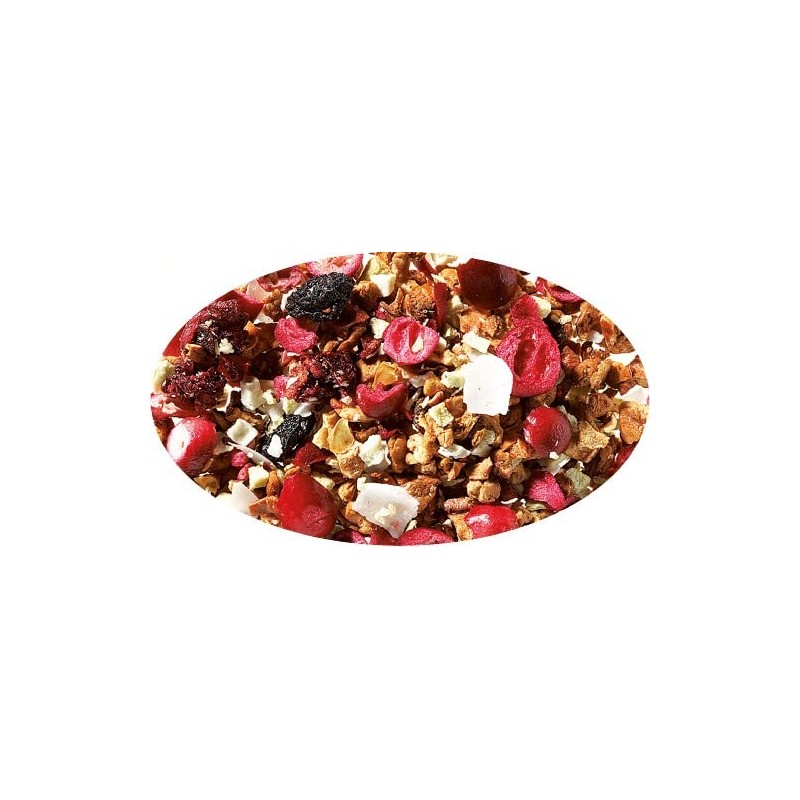 - Apple pieces, whole sour cherries, coconut chips, frozen Kiwi pieces, frozen Sour cherry pieces, frozen Cranberry slices, flavouring. Preparation of tea: