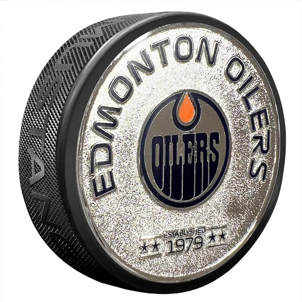 Add a piece of history to your hockey collection! This showstopper Edmonton Oilers hockey puck will be an eye-catcher among your collection. The unique features make this puck unlike any other puck in the collectible market. Finished with a shiny silver plating that adds richness and vibrancy to a classic medallion style, this work of art celebrates the vibrancy of the Oilers. The beautiful metal work is contrasted with a hand-painted, accented color-filled logo, making this a truly unique addition to your collection.