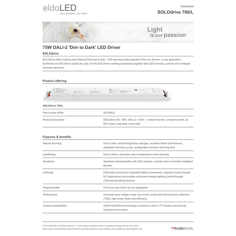 eldoLED | SL0760L 685MA LIN VLC | 75W DALI-2 'Dim to Dark' LED Driver | *2706A2