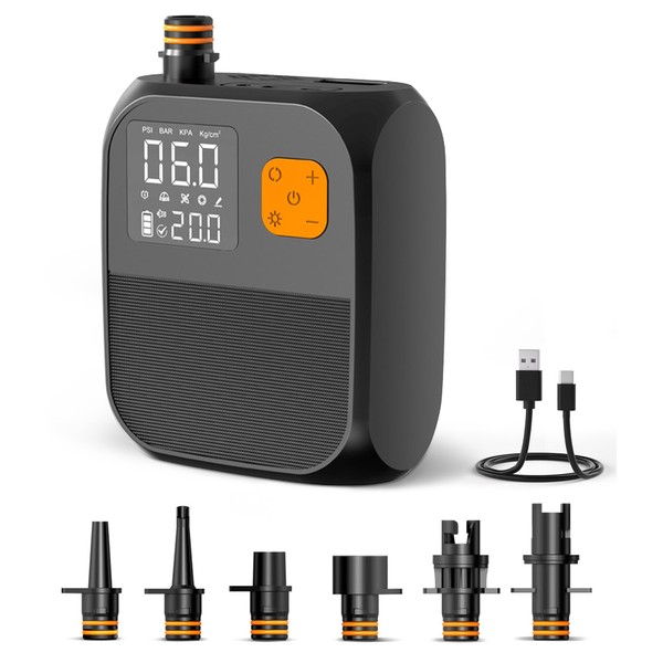 - Efficient and powerful: This electric paddleboard pump can reach up to 25 PSI, inflating paddle boards quickly and effortlessly, thanks to its high flow rate of 100L/min. It is equipped with a wireless design, built-in lithium battery, and Type-C interface for fast and convenient inflation in various scenarios.