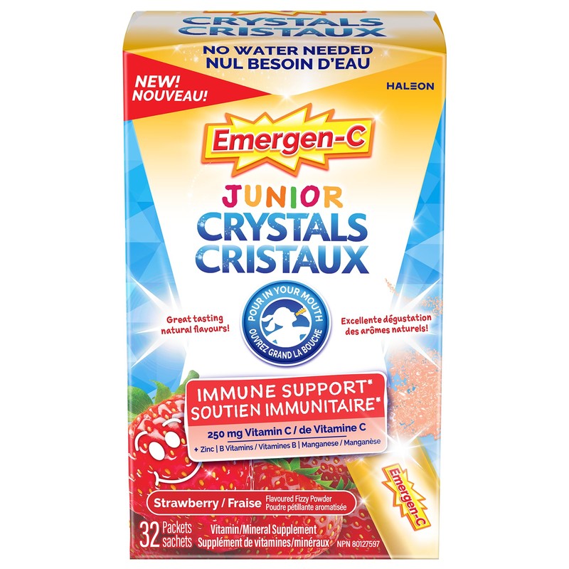 The no-water-needed, pour-in-your-mouth, immune support with a pop of flavour. New Emergen-C Junior Crystals provide a boost of vitamins and minerals to support kids' immune health, energy metabolism, and overall good health. Available in a tasty, all-natural strawberry flavour.