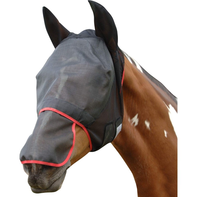 Benefits Comfortable full face fly mask in plastic mesh with soft stretch binding Removable nose piece attaches with strong Velcro Blocks over 70% of harmful UV rays and keeps flies out Stiff plastic mesh over upper face ensures no mask contact with eyes or eyelashes Softer plastic mesh on lower face secures with two durable Velcro fasteners Very soft stretch binding is gentle on face and keeps insects out Extra padding for vulnerable areas on nose and browband Rated highly in Horse