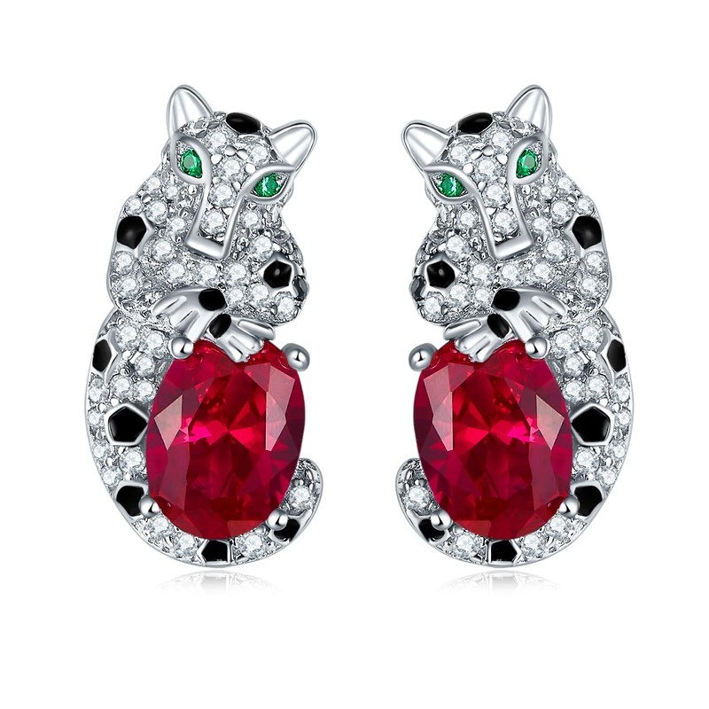 Elevate your style with these exquisite lab-created Ruby earrings, perfect for any occasion. Featuring oval-cut simulated Rubys in a rich Red color, reminiscent of animal cheetah style, they add a touch of elegance and sophistication to any outfit. The leopard design, accented with high-carbon CZ diamonds, adds sparkle and charm, making them a High end jewelry and luxury look.