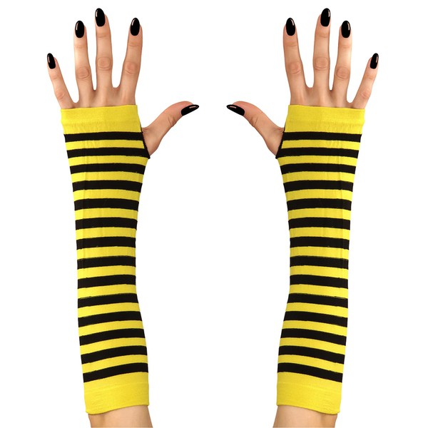 • The gloves are yellow and black striped. They reach almost to the elbows