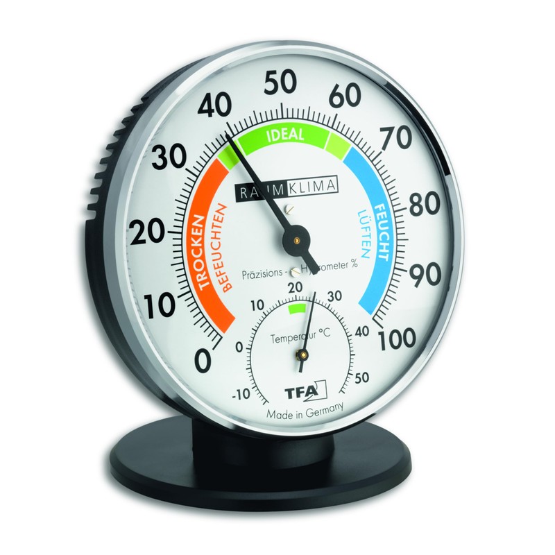 - Precision hygrometer synthetic hair for room air control. Monitoring device for your room climate. Made in Germany. This precise hygrometer/thermometer has been especially developed for room climate control. The scale shows the status of the air in your room and warns you if the air is unhealthy. It is clearly indicated whether you should air or humidify your room. The analog device does not require batteries and is very precise. A perfect device for controlling you room climate. A useful investment for healthy living. Technical specifications: diameter 100 mm, depth 26 mm, thermometer -15 to 60 degrees, precision +-1 degree, hygrometer 0 to 100%, measurement using synthetic hair, no batteries required, plastic casing, decorative chrome ring, for hanging or standing.