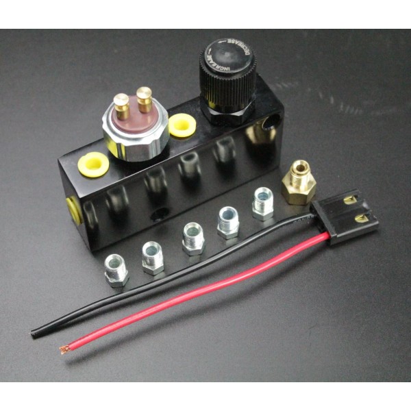 Description: This adjustable proportioning block allows you to run lines from the master cylinder to the block and then to the appropriate wheels. What is neat about it is that it also contains the proportioning valve and brake light switch. This dramatically reduces the amount of fittings needed and potential leaks. The adjustable proportioning valve regulates rear brake pressure, helping to maintain correct brake bias between front and rear brakes. It is designed for dual bowl master cylinders. The distribution block connects to the master cylinder and distributes brake fluid to all four wheels. An easy to turn handle with directional arrows makes it simple to either increase or decrease rear brake pressure. The block accepts 3/16" brake lines and the inlets and outlets on this unit are 3/8"-24 inverted flare females. It has two inlets from the master cylinder, two outlets to the front brakes and one outlet to the rear brakes. It includes five 3/16" fittings and wiring pigtail for rear brake light switch. Mounts to any convenient location. This is not a direct factory replacement for original blocks. Some line modifications may be necessary. Package includes: Black Adjustable Proportioning Valve w/ Distribution Block Five stainless steel fittings for 3/16" brake line Brake light switch and wiring pigtail Professional Installation is Highly Recommended (No Instruction and Wiring Diagram Included) |