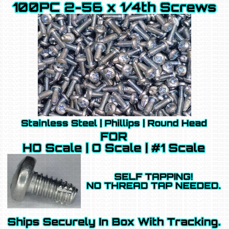 Evolved Rides Self Tapping 2-56 x 1/4th Screws 100PC Pack For HO & O & #1 Scale