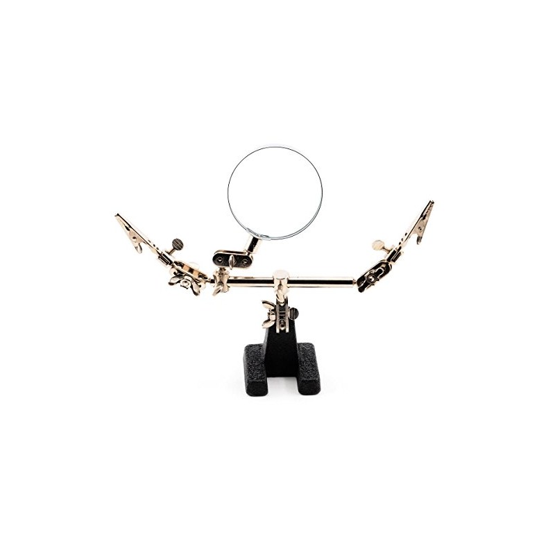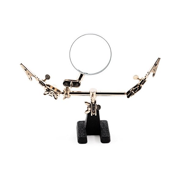 Excel’s #55675 double clips extra hands with magnifier are the ideal tool for working on intricate projects. Along with its heavy base for stability it has two spring loaded alligator clips mounted on ball joints to hold parts at any angle and 2X glass magnifier to assist on close work. Wing nuts on the ball joints make positioning easy.