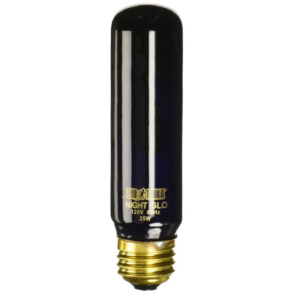 The Exo Terra Night-Glo T10 Moonlight Terrarium Lamp has a dark blue glass sleeve allowing it to emit a moon-like light that provides for nocturnal viewing. The heat generated by the bulb is minimal but enough to provide tropical night time temperatures. The lamp does not interfere with the natural night cycles of the reptiles, and it helps to stimulate breeding behavior in reptiles and amphibians. Reptiles require appropriate and high quality lighting in order to meet certain different metabolic needs. All bulbs are manufactured in colored glass, thereby preventing the fading or cracking as seen in coated bulbs. The Exo Terra Night-Glo T10 Moonlight Terrarium Lamp does not produce UVB rays. It can be combined with Repti-Glo or Sun-Glo bulbs for a 24-hour cycle.