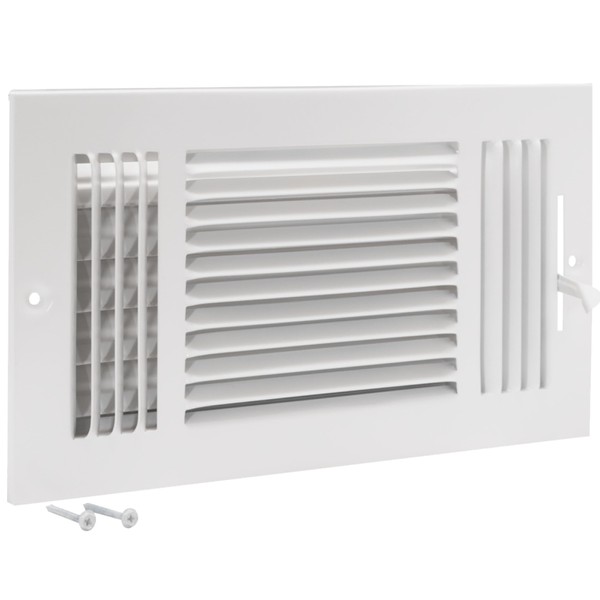 EZ-FLO's 8" x 4" Three-Way Sidewall/Ceiling Register has three-way air deflection and an adjustable damper. The all steel construction and powder coated finish makes this diffuser a long-lasting, durable choice. The included hardware makes for a quick and easy installation. Outer measurements are 9-3/4" x 5-3/4".