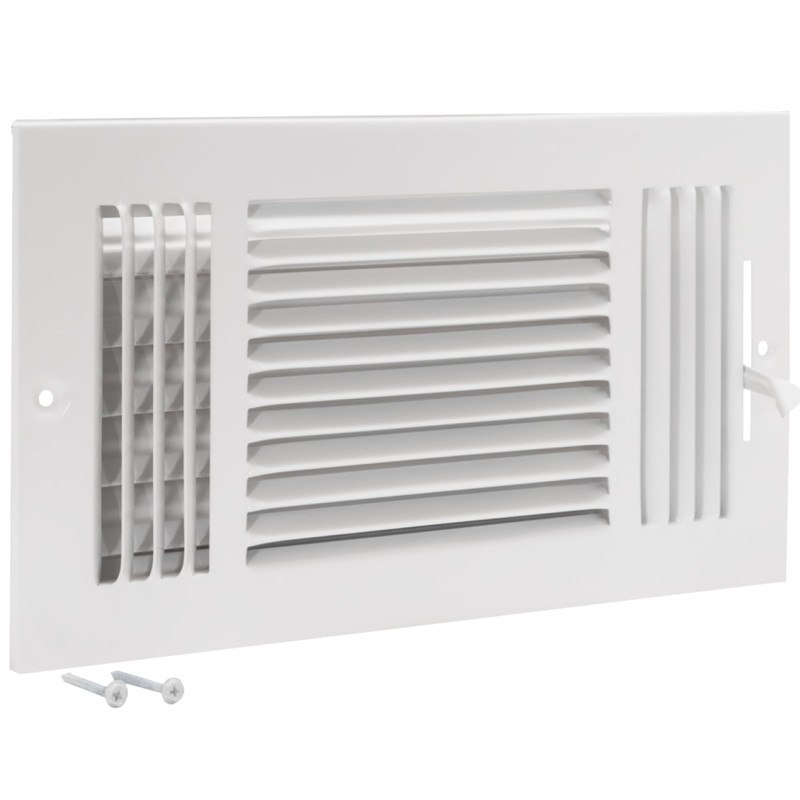 The EZ-FLO Three-Way Sidewall/Ceiling Register is constructed of heavy-duty steel with a white powder-coated finish that resists flaking and provides a longer-lasting performance. The register measures 9-3/4 inch x 5-3/4 inch overall, with a duct opening of 8 inch x 4 inch. Designed for use in both sidewall and ceiling locations, the steel register features a three-way air deflection to allow a better flow of air. The three-way sidewall/ceiling register includes (2) screws for an easy installation.
