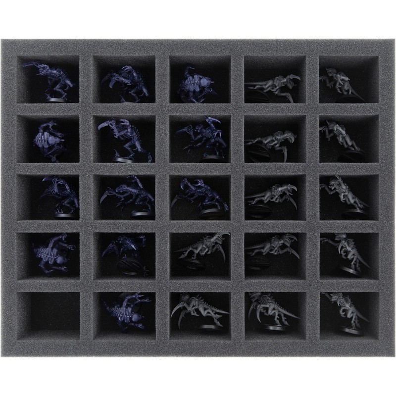 On this full-size foam insert you can safely store up to 25 standard miniatures of your tyranid army and transport them to the game table. The 25 equally sized compartments are ideal for hormagants, termagants or genestealers.
