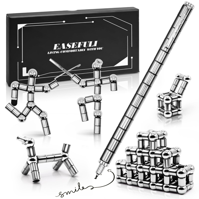 - [Magnetic Fidget Pen for Adults and Teens] This silver fidget pen is more than just a writing tool—it’s a versatile magnetic pen that serves as a stress-relief fidget toy, perfect as a gift for teen boys or young men. Rotate and transform it into creative shapes through endless combinations, offering diverse play options.