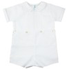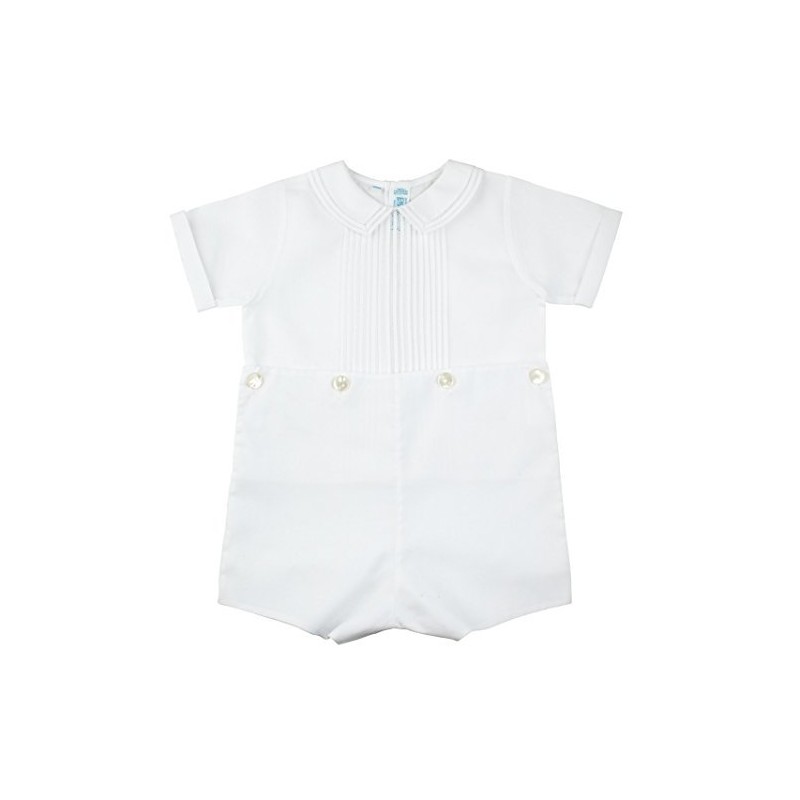 This classic bobby suit redefines elegance, with its soft white color and beautiful details. A sweet little collar features a double row of fagoting along the edge, to match the bodice - a double row of fagoting down the center surrounded by hand made pintucks. The crisp, short sleeve top fastens into the pants with dainty mother of pearl buttons at the waist. The perfect outfit for your precious little boy for holidays, special occasions, or Sunday wear. Classy, quality, and the vintage style you love! Machine Washable.