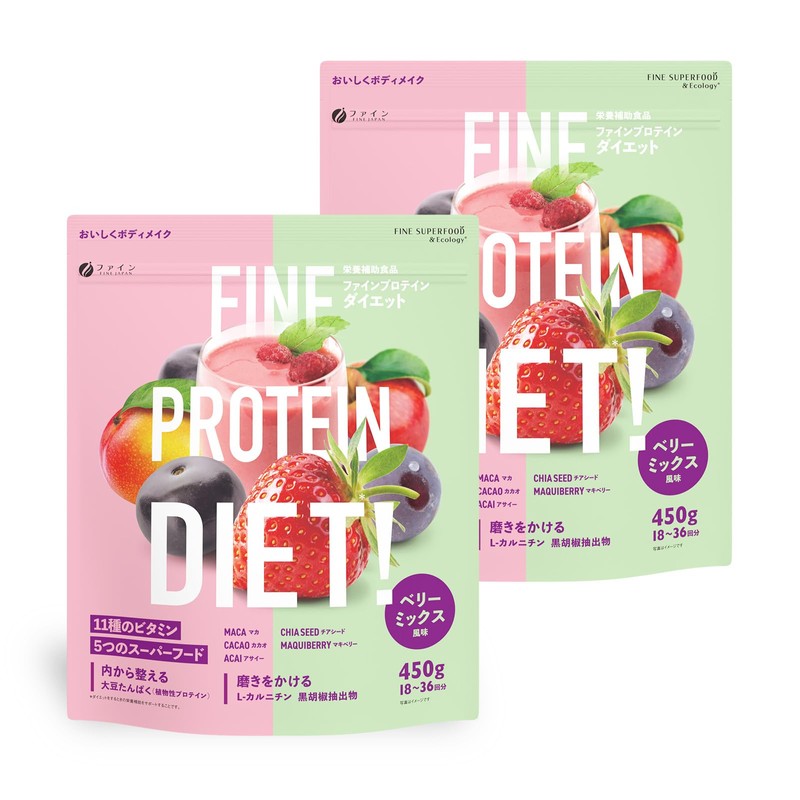 ファイン(FINE JAPAN) AYA推薦 ファインプロテイン ダイエット ベリーミックス風味 450g ソイプロテイン カルニチン チアシード アサイー マキベリー ビタミン 国内生産 × 2個セット