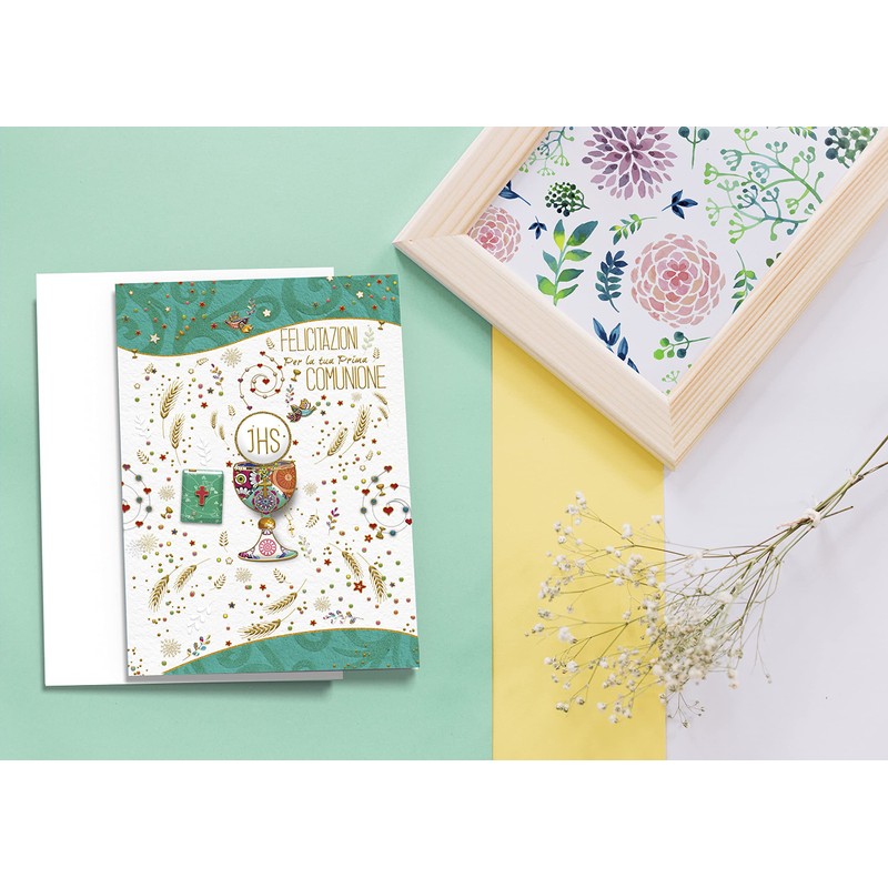 Color:Green Dimensions: 12 x 18 cm. Material: cardboard First Holy Communion Design Ideal writing accessory for the first communion of a family, friend or colleague. Product made from biodegradable cardboard. Made in Italy. With an embossed screen print with the words "Congratulations on First Communion". And all this goes to write the recipient's name next to the greeting message "that on the day of your first communion can open his heart so that you can feel the immensity of your love. Glück! Ideal for gift wrapping or bouquet