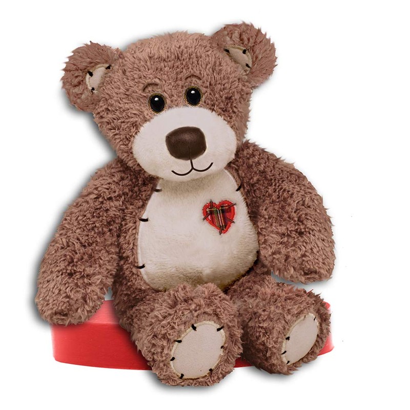 - Brown bear with glass eyes and a heart patch