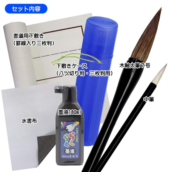 - Set Contents: Thick Wood Shaft Brush No. 7, Medium Brush, Calligraphy Writing Pad (Beige, 3-ply Ruled), Underlay Case (for Yatsu-cut and 3-sheet format), Ink Liquid, 6.1 fl oz (180 ml)