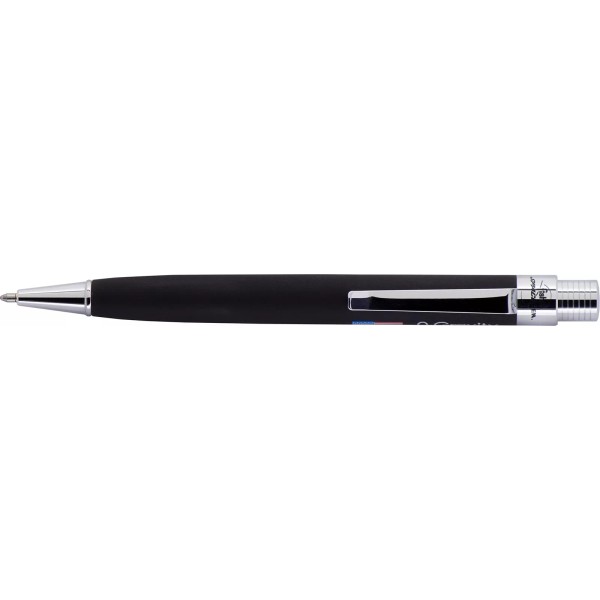 5.5" overall. Pocket clip. PR4 black ink, medium point cartridge. Writes upside down, at any angle, under water, over grease, and in extreme temperatures. Rubber finish. Color: Black and chrome. Boxed.
