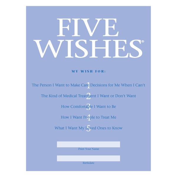 Five Wishes is an easy-to-use legal advance directive document written in everyday language. It helps all adults, regardless of age or health, to consider and document how they want to be cared for at the end of life. It is America’s most popular living will with more than 35 million copies in circulation.