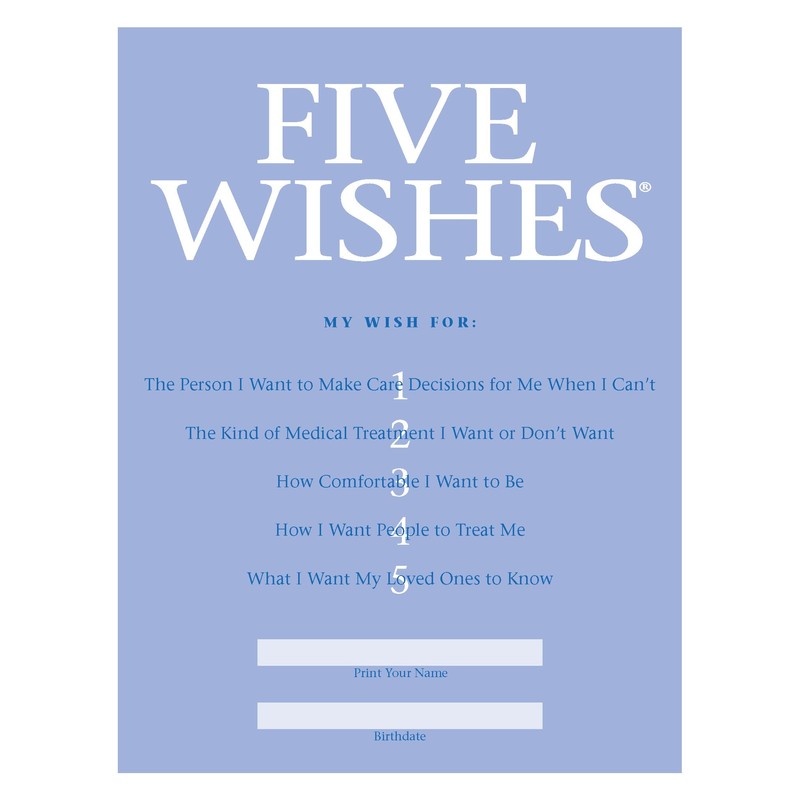Five Wishes is unique among all other living will and healthcare agent forms because it speaks to all of a person's needs: medical, personal, emotional and spiritual. Five Wishes also helps to guide and structure discussions with your family and physician, making conversations easier.