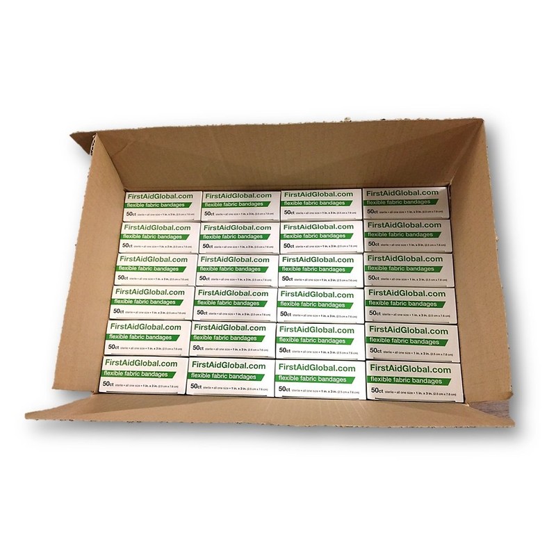- 24 boxes of 50 each Flexible Fabric Bandages by First Aid Global, LLC