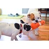 - A large, durable squeaker is enclosed in a stitched fabric pouch.