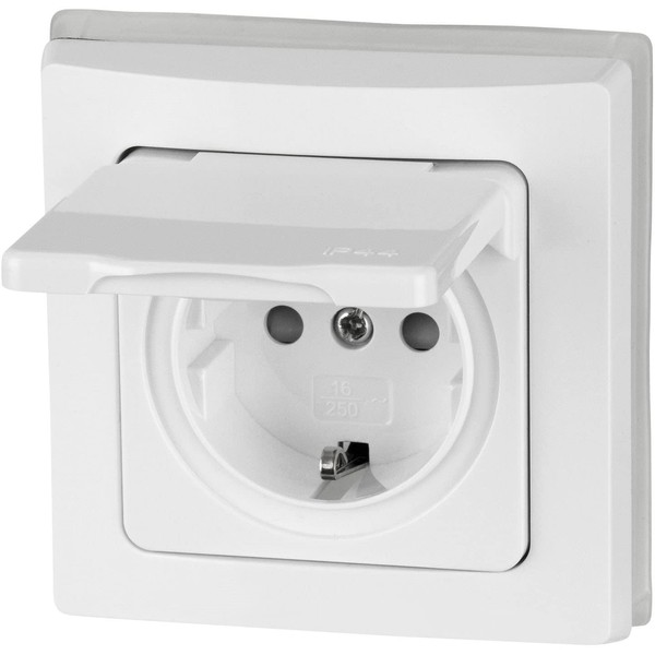 Compact and stable wet room recessed socket with spring cover and plug-in protection. Splash-proof, incl. Silicone Ring Ideal for use in the balcony, terrace and bathroom. All-In-One – already pre-assembled including frame, flush-mounted insert and cover.