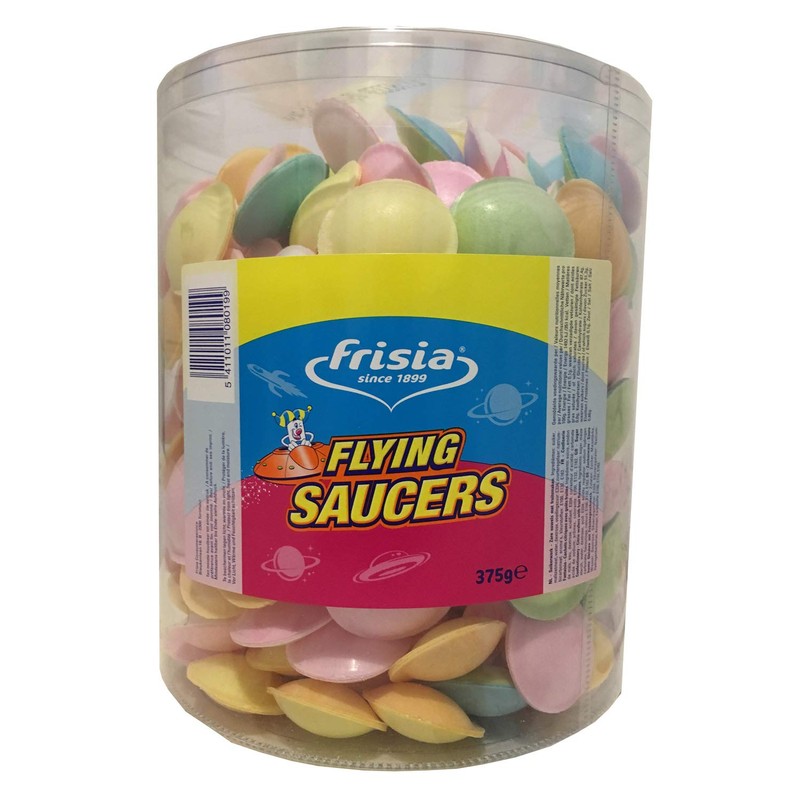 Flying Saucers Drum are made by Frisia.These are a Rice paper outer with sherbet filling inside centre.These are a fantastic retro sweet that are a kids all time favourite.They come in a assortment of colours.They come packed in a tub of 300 count that weighs 375g.