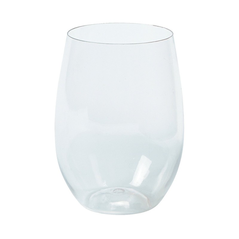 - Add a beautiful hue to your tables with these chic and simple Stemless Wine Glasses. Ideal for parties, wedding receptions or summer BBQs, these elegant clear wine glasses let you sip in style. Keep these disposable stemless sippers in your cupboard for last-minute events or for when doing dishes just isn't on the agenda. Discover even more disposable glasses and tableware for every occasion on our website. Plastic. 4 1/2" 12 oz.