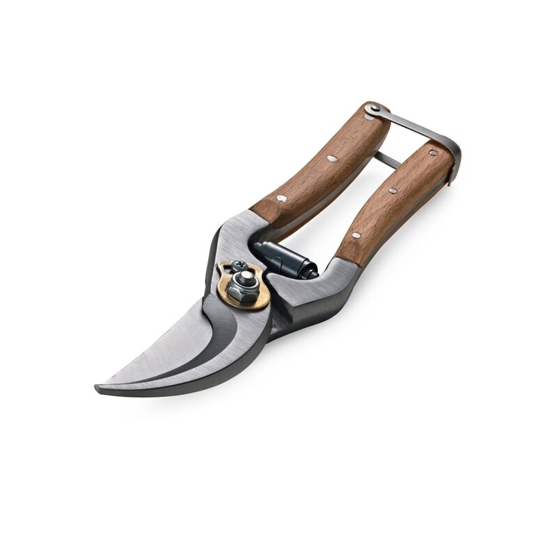 The handles of these garden shears are covered with beechwood, a hard and sturdy wood that feels comfortable in the hand: a particular advantage in colder weather. The garden shears are very solidly constructed; the screw for adjusting the cutting blades, made of unalloyed stainless steel (carbon steel), is secured with a guide plate, and the spring operates extremely smoothly.