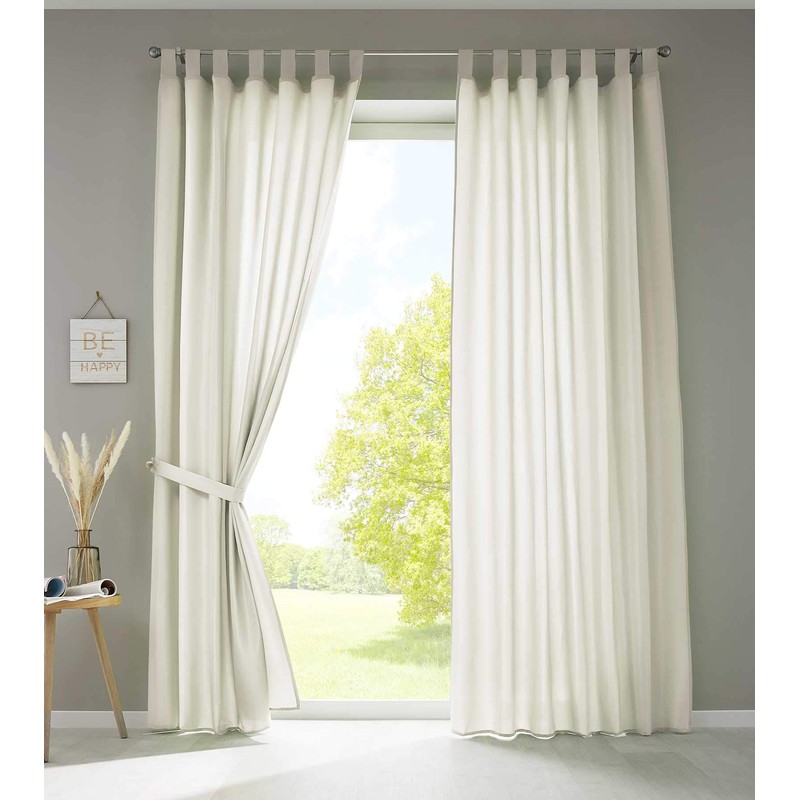 - Set of 2 opaque and translucent curtains made of micro satin with loops and ruffle tape. The curtains come complete with a tieback