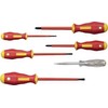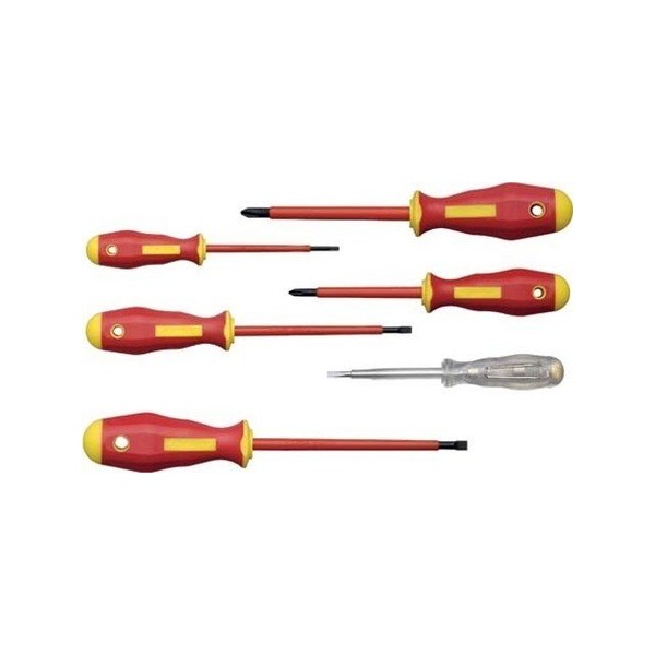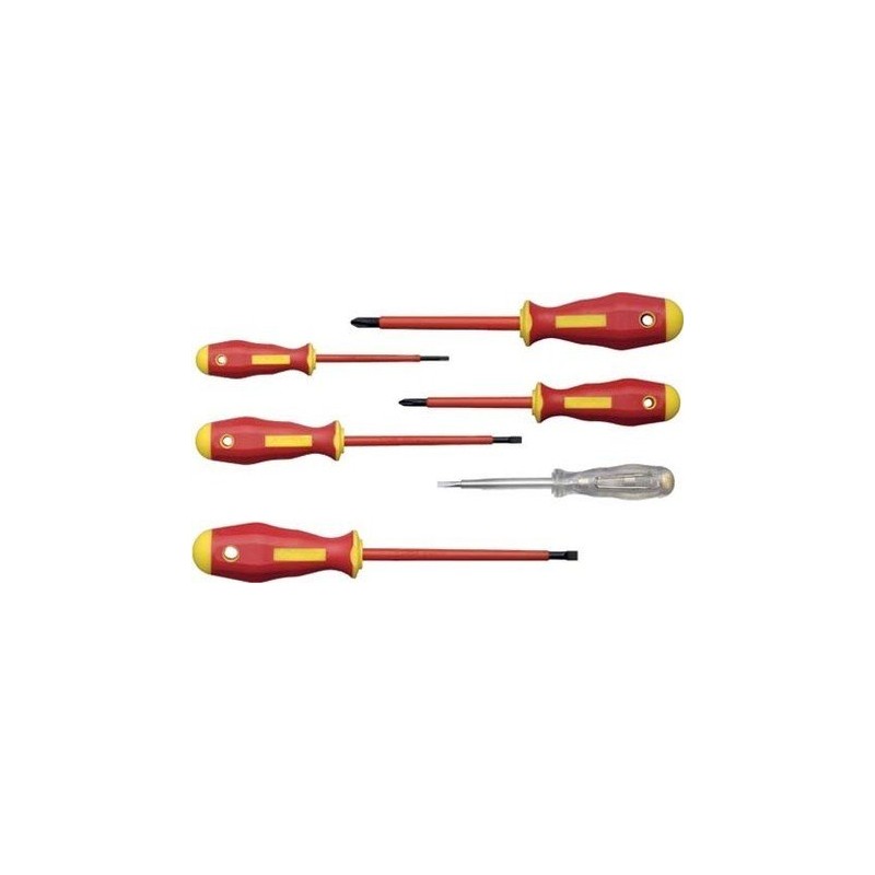 VDE-Schraubendreher-Set, 6-teilig, bestehend aus zwei VDE-Schraubendreher für Kreuzschlitz PH-Schrauben Phillips, drei VDE-Schraubendreher für Schlitzschrauben und ein Spannungsprüfer mit Kraftformheft, einpolig ### Merkmale * Anzahl der Kreuz-Schraubendreher PH: 2 * Anzahl der Kreuz-Schraubendreher PZ: 0 * Anzahl der Schlitz-Schraubendreher: 3 * Anzahl der Torx-Schraubendreher: 0 * Anzahl der Zangen: 0 * Anzahl der Ringschlüssel: 0 * Anzahl der Steckschlüssel: 0 * Anzahl der Ring-Maulschlüssel: 0 * Anzahl der Stecknüsse: 0 * Anzahl der Innensechskant-Schlüssel: 0 * Anzahl der Gabelschlüssel: 0 * Anzahl der Rollgabelschlüssel: 0 * Anzahl der Knarren: 0 * Anzahl der Steckeinsätze: 0 * Anzahl der Bit-Einsätze: 0 * Anzahl der Drehstifte: 0 * Anzahl der Meißel und Punzen: 0 * Anzahl der Hämmer: 0 * Anzahl der Sägen: 0 * Anzahl der Feilen: 0 * Anzahl der Holzbohrer: 0 * Anzahl der Steinbohrer: 0 * Anzahl der HSS-Spiralbohrer: 0 * Anzahl der Führungsbohrer: 0 * Anzahl der Stufenbohrer: 0 * Anzahl der Randversenker: 0 * Anzahl der Lochsägen: 0 * Anzahl der Kabelschneider: 0 * Anzahl der Multifunktionswerkzeuge: 0 * Anzahl der Koaxial-Werkzeuge: 0 * Anzahl der LWL-Konfektionierungswerkzeuge: 0 * Anzahl der Messgeräte: 0 * Anzahl der Testwerkzeuge: 0 * Gesamtzahl der Werkzeuge: 6 * Elektromonteur-Set: Ja * Heizungs-/Sanitärmonteur-Set: Nein * Verpackung: Karton