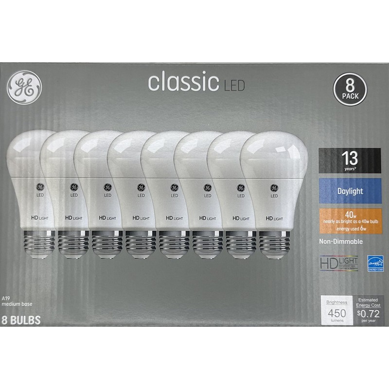 GE Classic LED Light Bulbs, 40 Watt Eqv, Daylight, A19 Standard Bulbs (8 Pack)