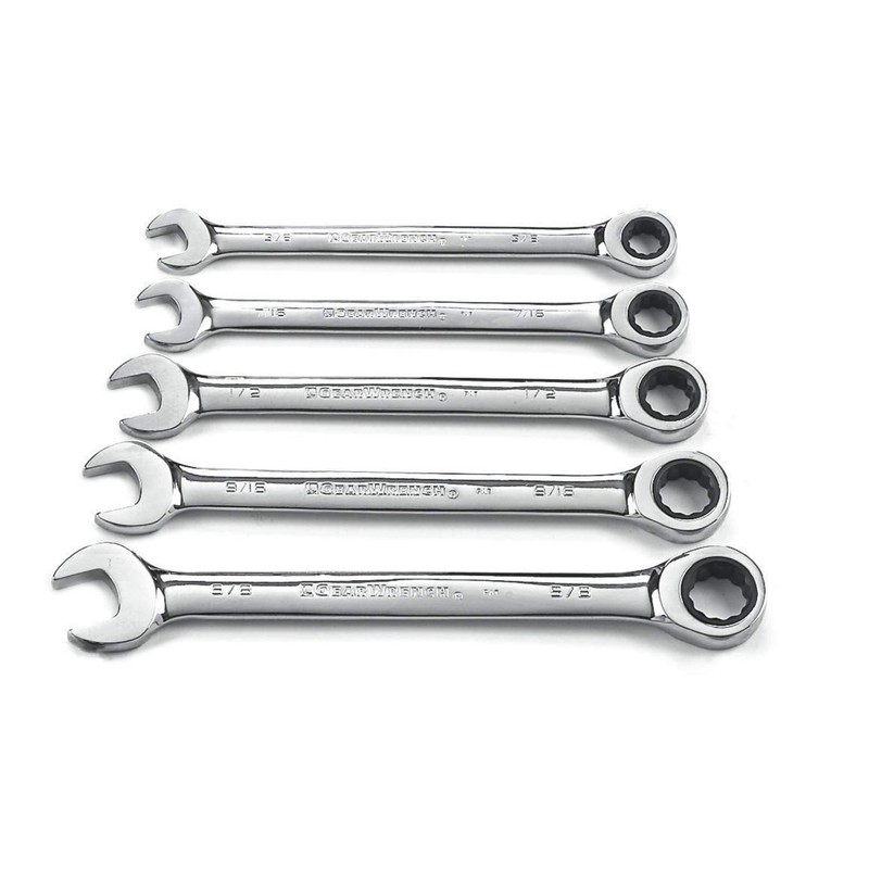 Gearwrench 5-Piece ratcheting wrench set, SAE. Consisting of: 9012 3/8-Inch combination ratcheting wrench, 9014 7/16-Inch combination ratcheting wrench, 9016 1/2-Inch combination ratcheting wrench, 9018 9/16-Inch combination ratcheting wrench, and 9020 5/8-Inch combination ratcheting wrench. Standard pattern ratcheting combination wrenches need as little as 5 degrees to move a fastener vs 30 degrees for standard wrench. Gearwrench surface drive design of box end provides for stronger grip on wrenches and less fastener rounding. Nickel chrome finish for long corrosion resistant tool life.