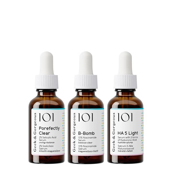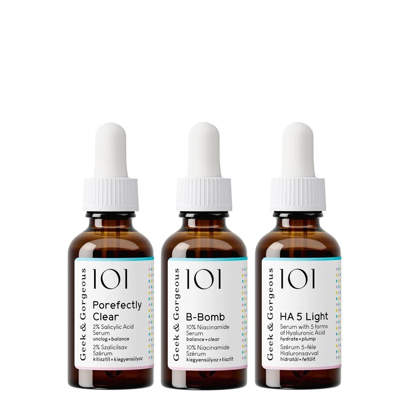 The Geek & Gorgeous Porefect Skin Set is a set that is perfect if you suffer from large pores, oily skin and want to tackle blackheads. The kit contains an exfoliant with 2% Salicylic Acid (also known as BHA), a serum with 10% Niacinamide and a super light, fast absorbing serum with Hyaluronic Acid.