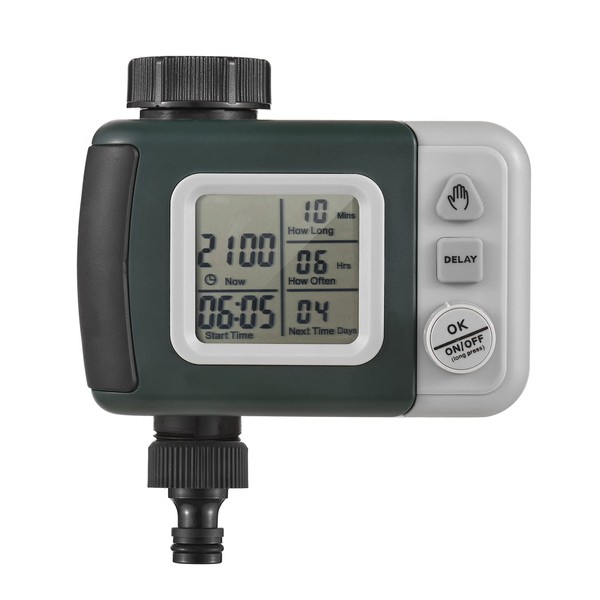 Programmed irrigation controller: set clock (hours and minutes), watering time, watering frequency and start time. It also supports rain delay function (manual operation) to save water-- irrigation will not be performed within the set time.