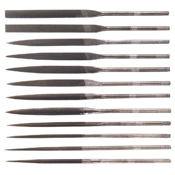 - This needle file set includes 12 file sizes : warding (flat), round, three square, square, crossing, oval, half round, knife, barette, slitting, joint round edge, and equalling (mill)