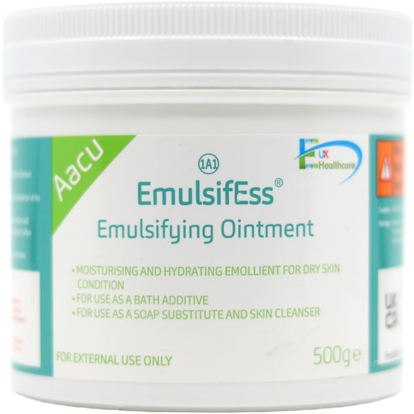 Product descriptionAacu EmulsifEss Emulsifying Ointment is a versatile skincare solution designed to moisturise and protect dry, sensitive skin. This 500g tub offers excellent value for those seeking long-lasting relief from conditions such as eczema, dermatitis, and psoriasis. The ointment creates a protective barrier on the skin, helping to lock in moisture and prevent further dryness. Its gentle formulation makes it suitable for all ages, including infants and the elderly, providing a soothing and softening effect on irritated skin.Safety Warningexternal use only