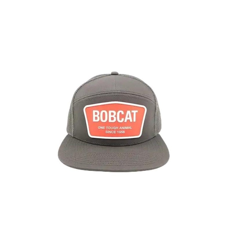 - Bobcat Flat Bill Hat, 7535776 is a structured seven panel flat bill cap with mid profile and a grey chino twill front. Features a grey mesh back with a Bobcat orange rubberized logo and a snapback closure. Decorated with a silicone patch saying One Tough Animal since 1958.
