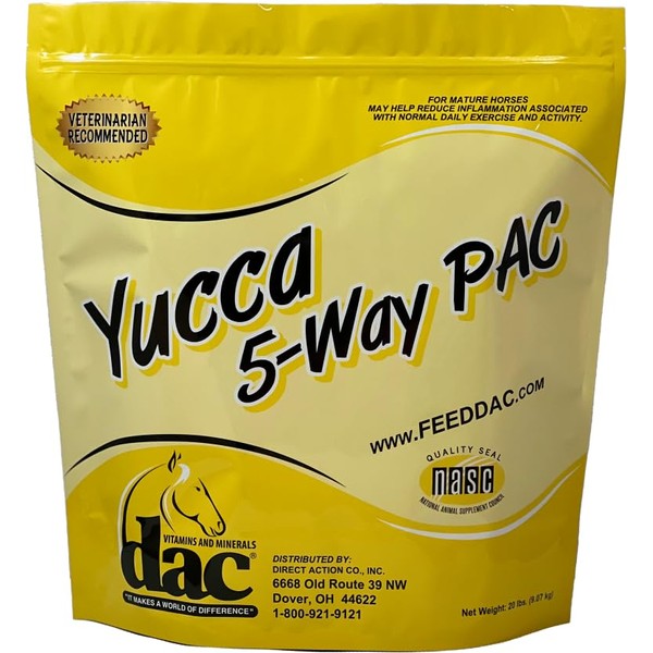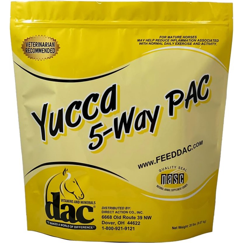 dac YUCCA 5-WAY PAC provides a trace mineral profile suitable for all classes of mature horses. Minerals play a critical role in numerous metabolic functions including: reproduction, bone development, nerve function, immune function, hoof, skin and coat quality as well as energy balance