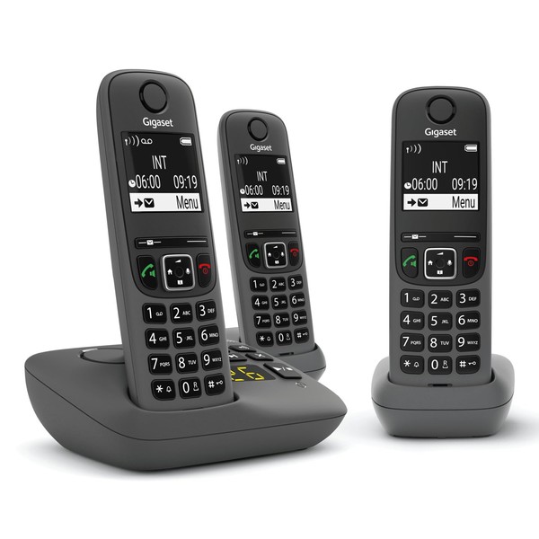 Gigaset AE690A Type: Analog/DECT telephone, Handset type: Wireless handset. Hands-free call. Maximum indoor range: 50 m, Maximum outdoor range: 300 m. Phonebook capacity: 100 entries. Caller ID Display diagonal: 5.08 cm (2"). Product colour: Anthracite. Number of handsets included: 3