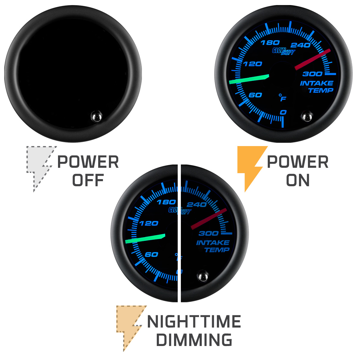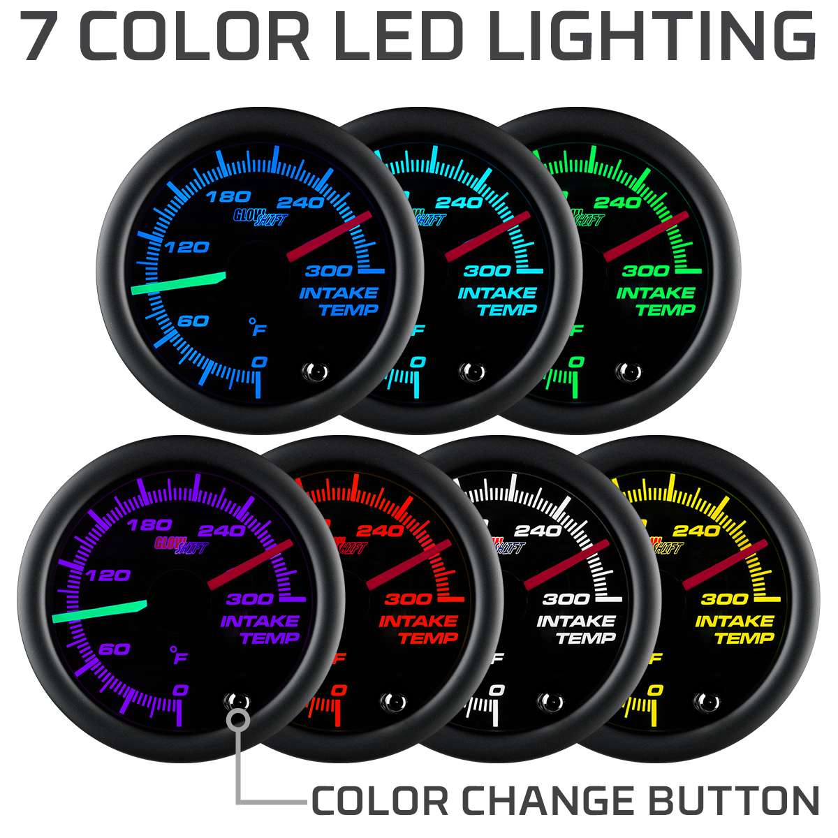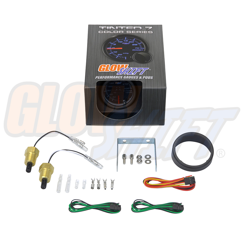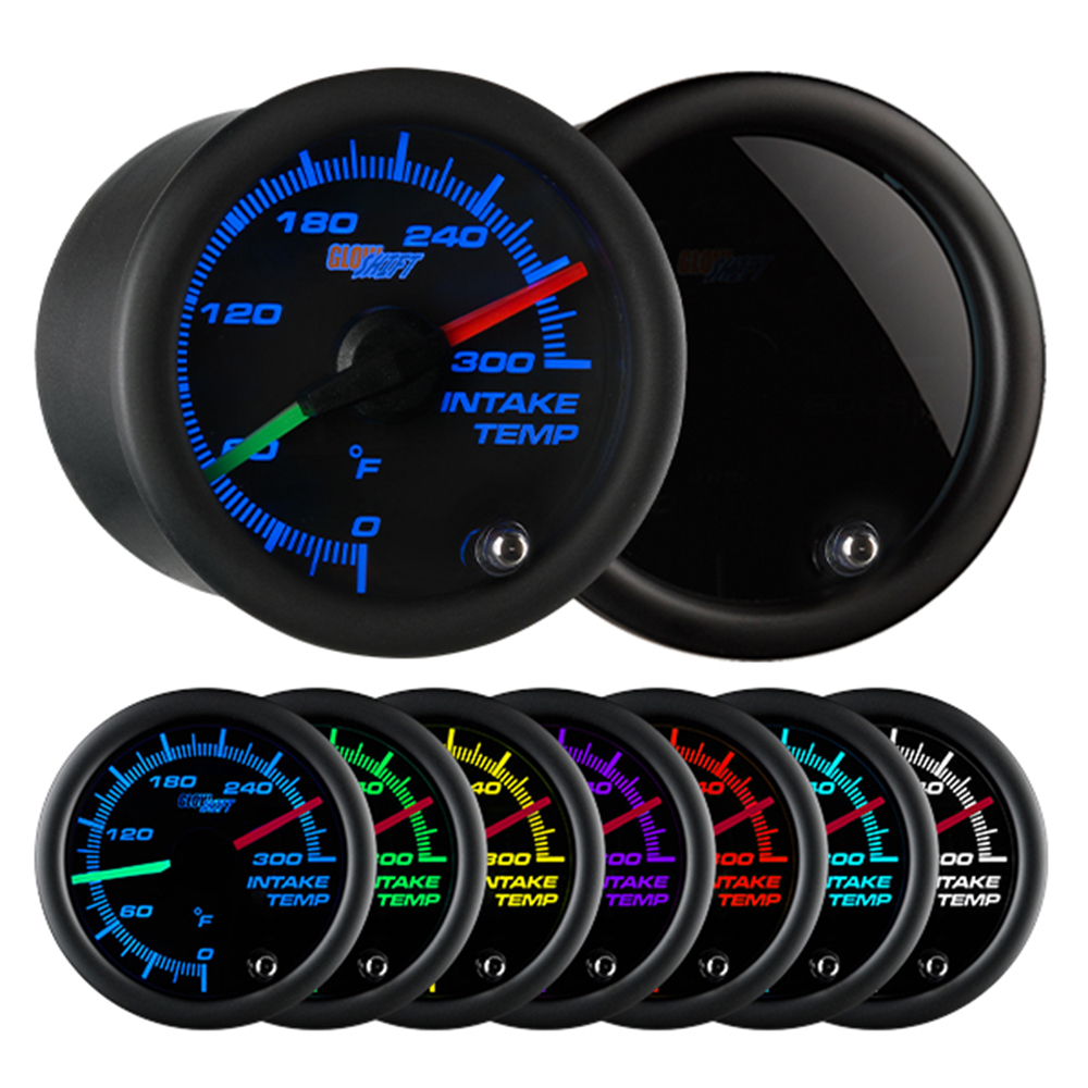 GlowShifts Tinted 7 Color Series Dual Intake Temperature Gauge enables you to monitor the efficiency of your vehicles intercooler system with two independent analog needles that read from 0 to 300° Fahrenheit. This 2-1/16 (52mm) dual intercooler air temperature gauge will measure the hot air being forced into your intercooler and the cool air being pushed into the engine. Parts required for installation are covered with accessories including (2) temperature sensors, wiring harnesses and mounting hardware.