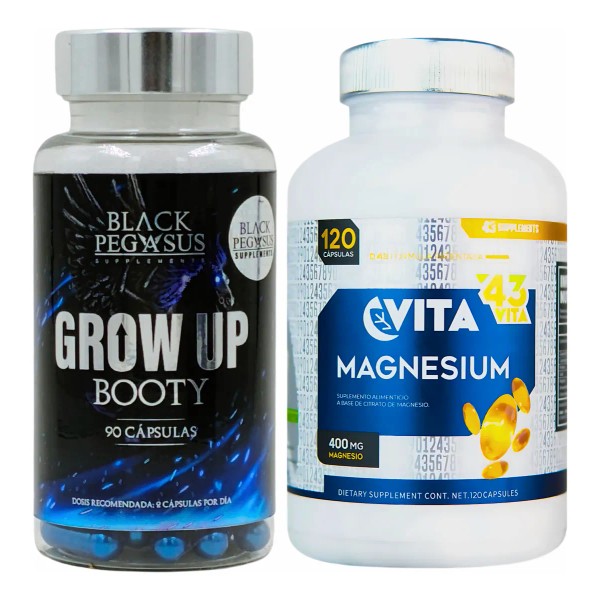 Este kit de suplementos en cápsulas combina Glúteo Peptonas Black Pegasus con Citrato de Magnesio. Está diseñado para un doble beneficio: el aumento y la firmeza de los glúteos mediante peptonas, y el soporte muscular, energético y óseo que proporciona el citrato de magnesio. Es una solución integral para quienes buscan mejorar su composición corporal y su bienestar general.